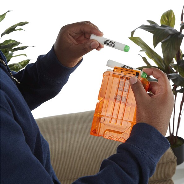 Jyn Erso, decidida a recuperar los planos de la Estrella de la Muerte diseñados por su padre, se armó con los mejores blásters para enfrentarse al Imperio. Este modelo destaca por su gran precisión y por su cargador de 6 dardos fluorescentes, que se disparan automáticamente con solo mantener pulsado el gatillo.